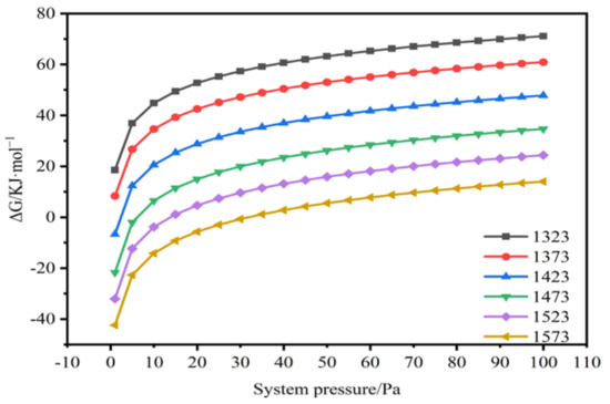 The Gibbs free energy of MoS2 decomposition varies with changes in pressure. Calculations of the Gibbs free energy at different temperatures (between 1273 K and 1723 K) and vacuum levels (between 1 Pa and 100 Pa) revealed that the decomposition temperature decreases as the vacuum level is reduced. As shown in Figure 10, the decomposition temperature of MoS2 decreases by approximately 50 K when the pressure is reduced from 5 Pa to about 1 Pa.