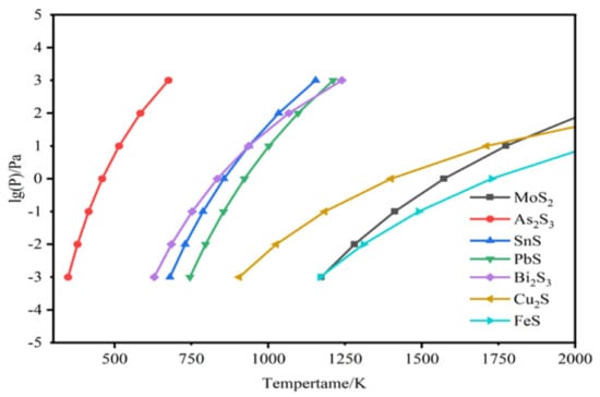Through the detection and analysis of experimental results, trace amounts of Pb, As, Bi, and other impurities were identified in the condensate. The XRF analysis also revealed that the raw material contained Fe, Cu, Si, K, and other impurity elements, including Fe, Cu, Pb, As, and Bi, are likely to be present in the form of sulfides. To investigate this further, the possible existence of metal sulfides was calculated using the saturated vapor pressure Equations (5). The results of these calculations are shown in Figure 11.