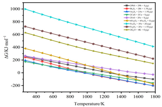 As illustrated in Figure 12, it can be deduced that the sulfides of As, Bi, and Pb all volatilize prior to decomposition, whereas the majority of oxides do not undergo decomposition reactions under optimal conditions. The decomposition of Fe2O3 to Fe3O4 occurs before the volatilization temperature, while the decomposition of Fe3O4 to another phase occurs at an exceedingly high volatilization temperature. It is also evident that the decomposition temperatures were too high to achieve volatilization.