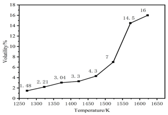 According to thermodynamic calculations, the decomposition temperature of MoS2 is 1467 K under a vacuum pressure of 5 Pa. This temperature was used as the basis for performing vacuum distillation experiments below and above this threshold. Using a one-way variable method, the dynamic vacuum was maintained at 5 Pa, and the holding time was fixed at 1 h while the effect of temperature on the vacuum distillation of molybdenum concentrate was investigated. Temperatures ranging from 1273 K to 1623 K, with 50 K intervals, were examined. The relationship between volatility and temperature was calculated using the volatility Equation (7).