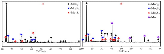 As the decomposition temperature of MoS2 is 1467 K, an increase in temperature beyond this point leads to increased volatility. Observations of the residue surface during experiments conducted between 1373 K and 1623 K, along with XRD analysis, provided significant insights. When the temperature rose from 1373 K to 1423 K, no signs of decomposition were observed on the surface of the residue, as shown in Figure 14a. Furthermore, XRD analysis of the residue (Figure 15a) confirmed that no decomposition of MoS2 occurred within this temperature range. However, when the temperature exceeded 1423 K, a light green layer was observed on the surface of the residue. XRD analysis revealed the presence of a new compound, Mo2S3, as shown in Figure 15b, which was produced by the decomposition of MoS2, consistent with theoretical calculations. At 1423 K, it can be concluded that sulfide impurities can be effectively separated and removed without the decomposition of MoS2. When the temperature was further increased to 1523 K, the main phases in the residue were MoS2 and Mo2S3, with the latter primarily formed through the decomposition of MoS2, as described by Equation (1). This result aligns well with theoretical predictions. At 1573 K, a new phase, Mo3S4, was detected in the residue (Figure 15c). According to the literature, Mo3S4 is an unstable compound that cannot be directly synthesized from a simple substance but can be prepared via acid extraction of ternary compounds such as MxMo3S4 [25]. During the experimental process, FeMo3S4 and other unstable phases may form, which undergo redox decomposition to produce Mo3S4. In a vacuum environment at 1273 K, Mo3S4 can decompose further into Mo2S3 and metallic Mo [26]. This explains the presence of incompletely decomposed Mo3S4 in the residue at 1623 K, as shown in Figure 15d. In addition, condensate analysis revealed small amounts of hard-to-volatilize compounds such as SiO2 and Fe2O3. According to the literature, Luo et al. [27] demonstrated that carbothermal reduction of SiO2 and Fe2O3 can result in the gasification of SiO2 to form SiO gas. The SiO gas undergoes volatilization and a disproportionation reaction in the condensation zone, producing SiO2 and Si. The reduction reaction of SiO2 is complex and may contribute to the observed residues. At the optimum temperature, the molybdenum content in the residue was measured to be 53.03 wt% using standard methods, with the purity of MoS2 increasing to 88.41 wt%. Additionally, a small amount of oil-like material was found on the condensation tray during the experiments, suggesting that flotation oil agents present in the feedstock could also be effectively removed by vacuum distillation [28].