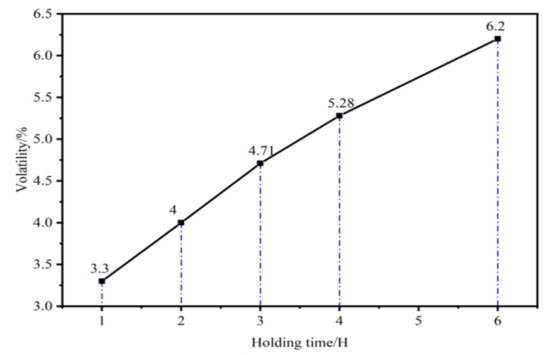 After determining the optimum distillation temperature of 1423 K using the one-way variable method, experiments were conducted to investigate the effect of holding time. The holding temperature was maintained at 1423 K, and the holding time was varied from 1 to 6 h in increments of 1 h. The residues were weighed after each experiment, and the volatilization rate was calculated, as shown in Figure 16.