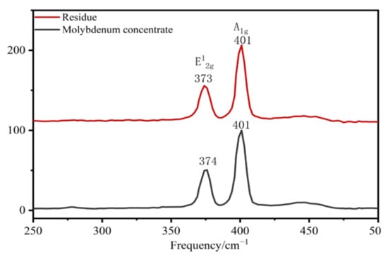 Raman spectra of molybdenum concentrate (black line) and residue (red line).