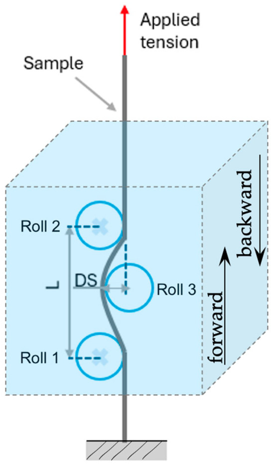 The simulations were performed using Abaqus 2017 software, employing the CBT method. In this setup, the apparatus consists of three rolls, as illustrated in Figure 1. The rolls move in a cyclic forward-and-backward motion, inducing bending deformation while the sample is simultaneously subjected to uniaxial tension. Key geometric parameters of the device include the bending depth (denoted as DS), the distance between the support rolls (L), and the diameters of the rolls.