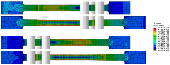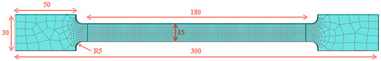 The test specimen considered for simulation had a thickness of 2.5 mm to increase the forces developed in the CBT equipment, and its overall dimensions are shown in Figure 2. The test specimen was modeled using 6222 C3D8I elements, which are fully integrated eight-node hexahedral elements with incompatible modes, generated with two different meshing techniques. These elements are well-suited for capturing the bending-dominated deformation modes in the CBT process, providing accurate stress and strain predictions while mitigating shear-locking effects. In the jaw area, the Sweep technique was used with the Advancing front algorithm, while in the test area, the Structure technique was employed. The choice of two different meshing techniques is due to the specimen’s geometry since it was difficult to find a unique meshing technique that fits the entire specimen.