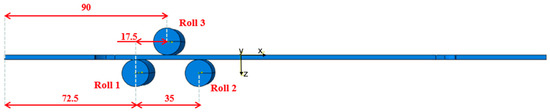 The rolls were modeled as 3D analytical rigid shells with a radius of 7.5 mm and a length of 30 mm. Since the rolls were defined as analytical rigid parts, meshing was not required. The material definition was carried out with the material’s stress–strain curve and isotropic hardening. Additionally, the initial yield locus shape was described by the von Mises yield function. Regarding the assembly of the setup, as mentioned before, it was set similarly to other studies [12]. The three rolls begin in contact with the test specimen. One of them is placed on one side of the specimen (roll 3), while the other two are placed on the other side (roll 1 and roll 2); this schematic is presented in Figure 3, which also provides the distances between the parts. The rolls were placed at the start of the specimens’ test area. The first roll is positioned 72.5 mm from the specimen’s tip, ensuring contact within the test zone. The lower rolls (rolls 1 and 2) are set 17.5 mm apart from the upper roll (roll 3, responsible for bending), with 35 mm between the lower rolls. Furthermore, to maintain roll 3’s contact exclusively with the test zone and adhere to the predefined distances, its distance from the specimen’s tip was set at 90 mm. To ensure proper displacement of the rolls and bending depth, as well as to simulate tension on the tip of the specimen, three displacement-type boundary conditions (BCs) were implemented. For roll 3, two conditions were necessary: one controlling the depth setting, involving a downward motion of 2 mm along the Z-axis (labeled as “Depth setting” in the initial step). The second enabling displacement along the specimen (X-axis), set at 125 mm, was similarly applied to rolls 1 and 2. Additionally, to simulate tension on the furthest tip of the specimen, a BC was defined with a displacement of 1 mm per second. Furthermore, an Encastre BC was established on the other tip of the specimen to prevent any movement during the simulation.