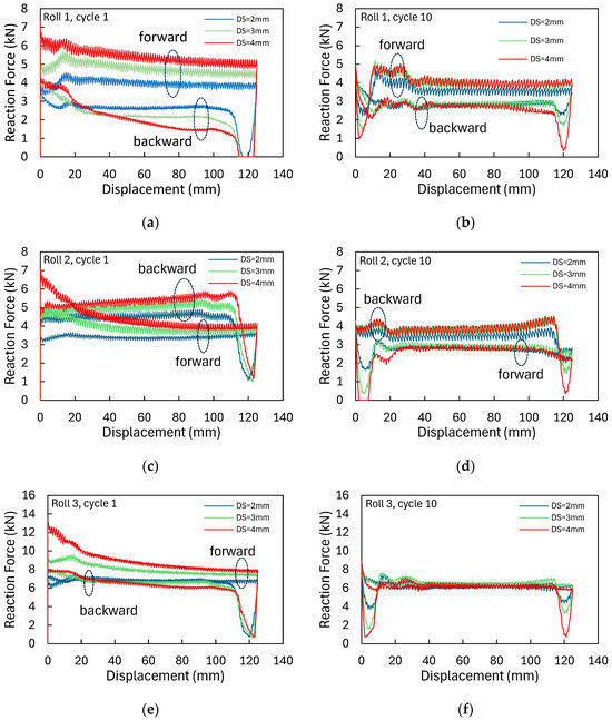 Effect of bending depth (DS) on force vs. displacement curves for: (a) roll 1 at the first cycle; (b) roll 1 at the last cycle; (c) roll 2 at the first cycle; (d) roll 2 at the last cycle; (e) roll 3 at the first cycle; (f) roll 3 at the last cycle.