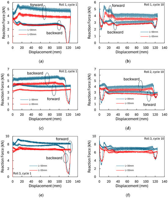 Effect of L on force vs. displacement curves for: (a) roll 1 at the first cycle; (b) roll 1 at the last cycle; (c) roll 2 at the first cycle; (d) roll 2 at the last cycle; (e) roll 3 at the first cycle; (f) roll 3 at the last cycle.