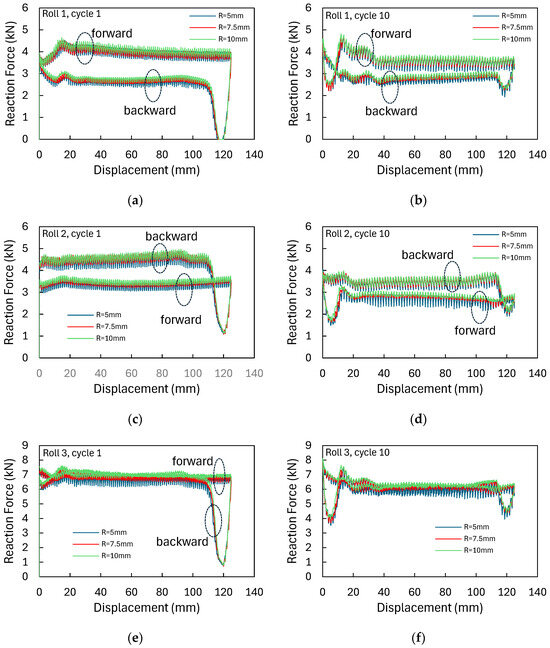 Effect of roll’s diameter on force vs. displacement curves for: (a) roll 1 at the first cycle; (b) roll 1 at the last cycle; (c) roll 2 at the first cycle; (d) roll 2 at the last cycle; (e) roll 3 at the first cycle; (f) roll 3 at the last cycle.