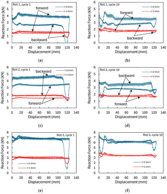 Effect of sheet thickness on force vs. displacement curves for: (a) roll 1 at the first cycle; (b) roll 1 at the last cycle; (c) roll 2 at the first cycle; (d) roll 2 at the last cycle; (e) roll 3 at the first cycle; (f) roll 3 at the last cycle.