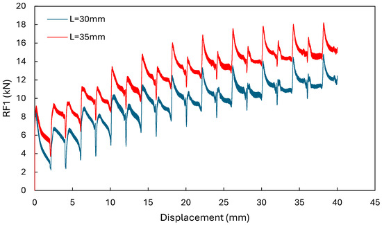 Figure 10 compares the reaction forces on the specimen for two different L values: 35 mm and 30 mm. In contrast to the forces on the rolls, reducing the L value to 30 mm decreases the reaction forces on the specimen across all ten cycles. In fact, the highest force reached was approximately 18 kN and 15 kN for an L value of 35 mm and 30 mm, respectively. This is due to the stronger bending for lower L.