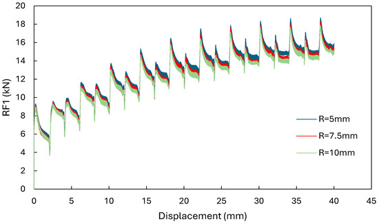 With the same simulations performed before, it is also possible to evaluate the influence of the same parameters on the reaction forces of the specimen during the CBT process, consistently considering ten cycles. Figure 8 illustrates the force vs. displacement curve for the “default” simulation, where none of the parameters were modified. RF1 represents the reaction force in the X direction (along the length of the specimen), obtained at the tip of the specimen that is being pulled. The forces increase steadily with the number of cycles but tend to stabilize around the eighth cycle. This result is consistent with previous findings in the literature [9,11,14,22]. After several cycles, the force–displacement curve stabilizes, rises to a maximum, and then gradually decreases. For the material under investigation and reference setup, the stabilization initiates after the 8th cycle. The number of cycles needed to reach this peak is influenced by the balance between bending and uniaxial tension deformation. Specifically, when bending predominates, the saturation point is delayed, whereas it occurs more rapidly when uniaxial tension is the dominant deformation mode. Furthermore, the equivalent plastic strain is significantly influenced by the magnitude of bending. The results suggest that lower equivalent plastic strain is associated with reduced bending, which leads to faster material saturation. This is sustained also by the results presented in Section 3.2.1 and Section 3.2.4. Namely, as shown in Figure 9, which analyzes the effect of depth setting on the force vs. displacement curve, stabilization occurs after eight cycles for a depth setting of 2 mm, corresponding to an equivalent plastic strain of 1.42. In contrast, stabilization is not observed for depth settings of 3 mm and 4 mm, where the equivalent plastic strains are 2.465 and 3.461, respectively. Another clear example of this effect is presented in Figure 12, where the curve corresponding to a lower thickness (i.e., less bending) exhibits earlier stabilization and lower equivalent plastic strain (0.8587).