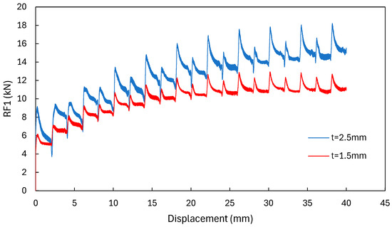Lastly, Figure 12 displays the reaction forces for specimens with thicknesses of 2.5 mm and 1.5 mm. Reducing the thickness to 1.5 mm results in a notable decrease in reaction forces and faster stabilization of the force peaks over the ten CBT cycles. The highest force recorded for the thicker specimen was approximately 18 kN, compared to 12.5 kN for the thinner specimen. Once again, specimen thickness proves to have a significant impact on force values. It proves that the more intense bending that exists in the thicker material delays the saturation of the material, showing the increase of the force even after 10 cycles.