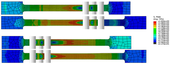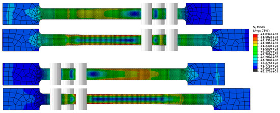 Equivalent stress distribution for the L = 30 mm conditions from top to bottom: 1st cycle forward, 10th cycle forward, 1st cycle backward, 10th cycle backward.