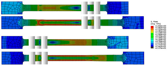 Equivalent stress distribution for the “default” conditions from top to bottom: 1st cycle forward, 10th cycle forward, 1st cycle backward, 10th cycle backward.