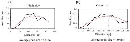 Grain size distribution diagram with second-order polynomial fitting curve (red dotted line) for (a) the as-received specimens and (b) the annealed specimens.