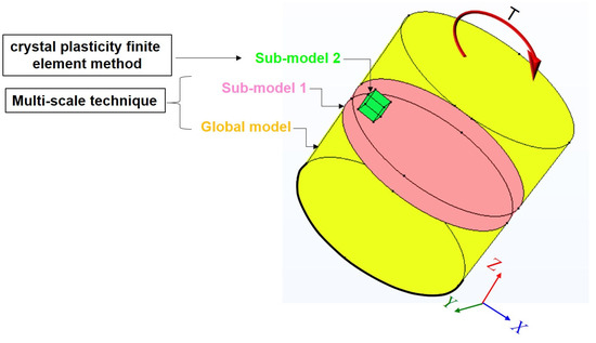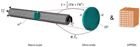 The FE² technique, known as a multiscale problem formulation in computational mechanics, provides a framework for systematically bridging for investigation of materials or structures across macroscopic and microscopic scales. In this study, we investigated a twisting process with the help of two submodels. This method is a multiscale approach to address the interactions between micro- and macrolevel mechanisms, which was used for an aluminum wire under torsion process. In the macroscopic (global) model, the material was treated as a homogeneous continuum. In this scale, the constitutive behavior was described by the J2 plasticity model (von Mises yield criterion) with isotropic hardening, and the simulations were carried out using the Abaqus/Explicit solver to capture the bulk deformation responses. The submodel technique in Abaqus was used to connect the macroscopic (global) and microscopic (submodel) models. A combination of the Abaqus/Standard solver and the Düsseldorf Advanced Materials Simulation Kit (DAMASK) software version 2.0.2 was used to simulate the multiscale crystal plasticity of pure commercial aluminum wire under torsional deformation based on the equations in Section 2.2. This method, known as the full-field crystal plasticity finite element method (CPFEM), provides a comprehensive approach to modeling the microstructure behavior of materials [35,59,60]. Both the global model and the submodel used solid elements. As shown in Figure 3, the multiscale system that connected the macroscopic behavior and microscopic mechanics was developed using the equations below.