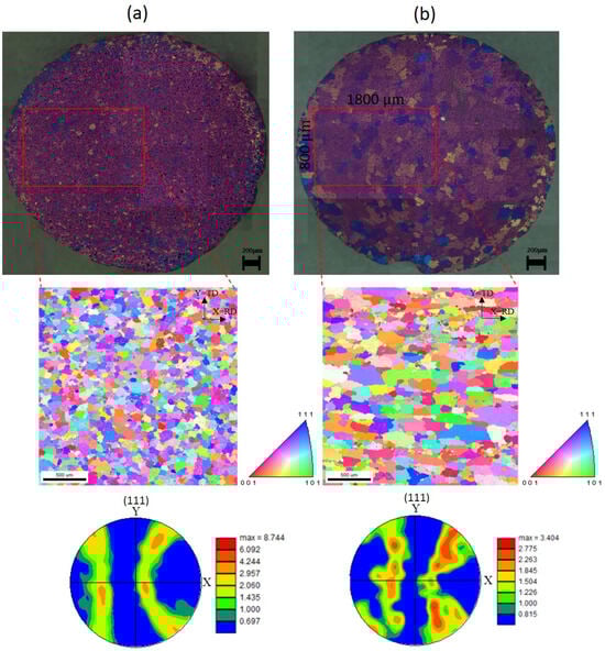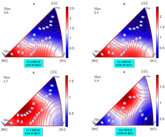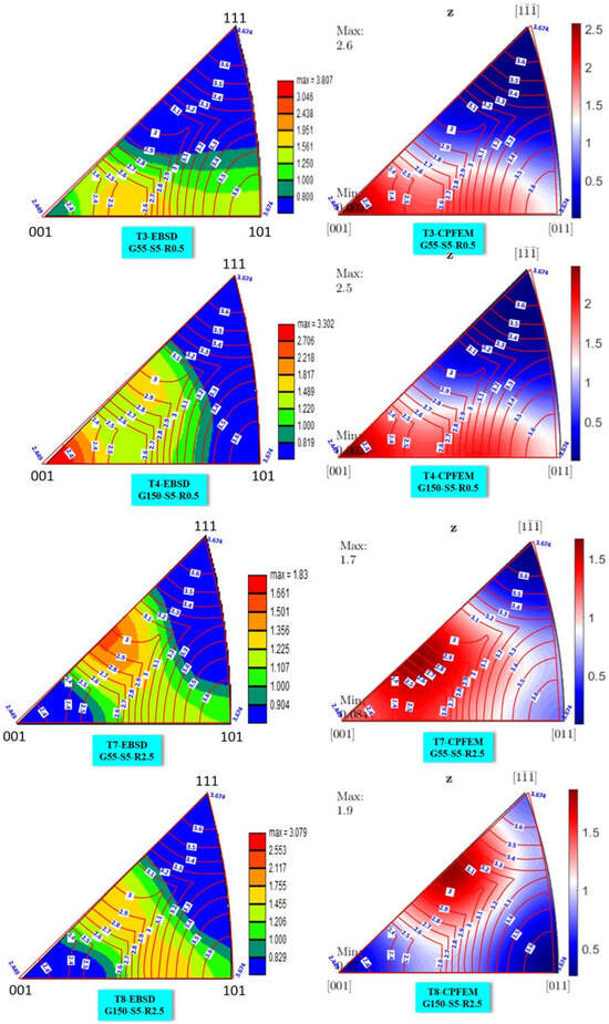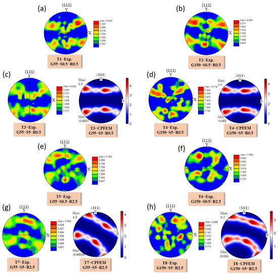 The experimental pole figures measured by EBSD were compared with selected CPFEM simulation results, as depicted in Figure 10. The pole figure results were obtained on the crystallography plane (111).