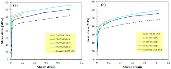 Shear stress–shear strain curves extracted from experimental torsional loading for (a) as-received specimens [55 μm] and (b) annealing specimens [150 μm].