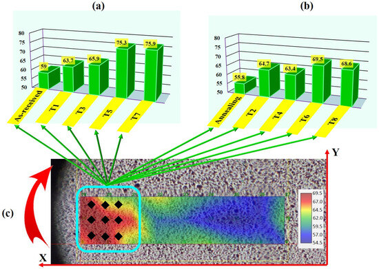 The hardness maps of the measured specimens were similar to what is shown in Figure 9c. The average hardness value (of nine points of measurement) within the light blue box in Figure 9c for both specimens, as-received and annealed, are presented as line graphs in Figure 9a,b. The hardness of the as-received specimens increased from 59 0.2 HV to 75.9 0.2 HV, while the annealed specimens exhibited an increase in hardness from 55.5 0.2 HV to 69.5 0.2 HV.