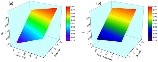 - For specimens undergoing 2.5 revolutions, at the strain rate of 0.5 rpm, with increasing average grain size, a 2.3% increase in the average TF was observed, while at the strain rate of 5 rpm, only a 1.3% increase occurred.