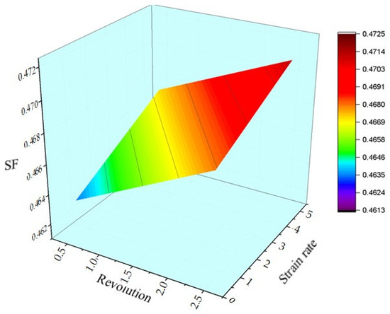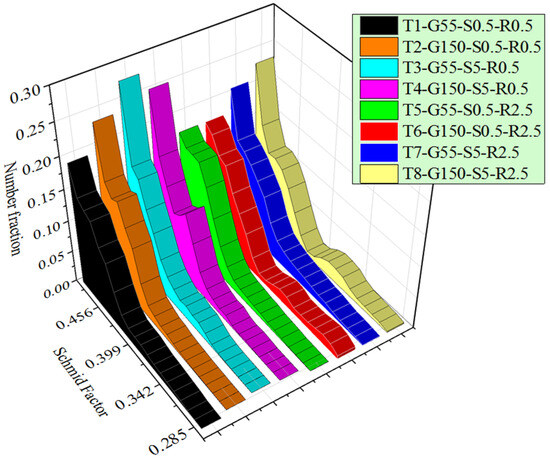 The maximum average SF in the torsional loading on aluminum wires occurred when the strain and strain rate had the highest values. The effect of the increase in strain (revolutions) was greater than that of the increase in the strain rate. Therefore, in a specimen with an average grain size of 55 μm and constant strain rate 0.5 rpm, with an increase in revolutions from 0.5 to 2.5, the average SF increased from 0.4613 to 0.4657, while with an increase in strain rate from 0.5 rpm to 5 rpm, the average SF increased from 0.4657 to 0.4695 in a specimen with an average grain size of 55 μm undergoing a constant 2.5 revolutions. It was concluded that the average SF in wires under torsional loading was more strain-rate dependent than strain dependent. A higher average SF shows that a particular slip system experiences a greater resolved shear stress, thus increasing its activation probability during deformation. In contrast, lower average SFs may have less favorably oriented grains, resulting in delayed slip system activation and enhancing the strain-hardening effect.