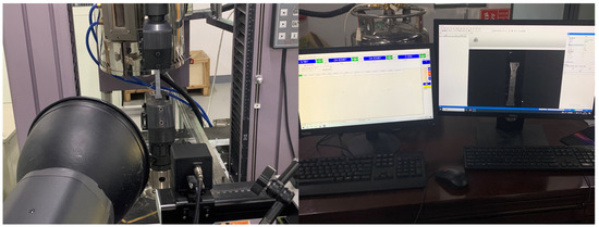 Uniaxial tensile tests were performed using the universal testing machine at room temperature under quasi-static conditions, as shown in Figure 2. An XTOP three-dimensional digital image correlation (3D-DIC) system with a resolution of 2448 × 600 pixels was used to record between 200 and 250 images for each experiment during the experiment to measure and analyze the deformation of the specimen. A EF11-100 LED was used throughout the experimental process to enhance DIC calculations by improving contrast and reducing glare on the specimens. Before starting the experiment, spray paint was used to apply uniform black and white speckles on the surface of all specimens. For the dogbone experiment, the crosshead speed was set to 3.6 mm/min, corresponding to a strain rate of 0.001/s under quasi-static conditions. The axial extensometer gauge length was 30 mm, and the stroke was calculated by measuring changes in axial gauge length throughout the experiment by using the GOM 2018 software. To achieve accurate measurement results, the extensometer was positioned in a region where deformation was uniform at both ends of the specimen’s parallel zone.