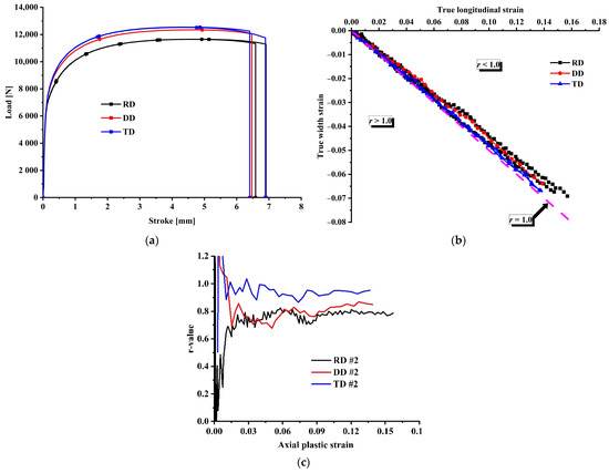 Experimental results of the dogbone specimens in various directions: (a) load–stroke curve; (b) axial strain and width strain for r-value computation; (c) r-value evolution along RD, DD, and TD.