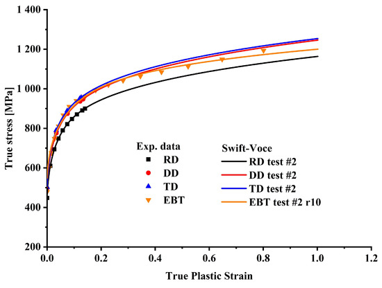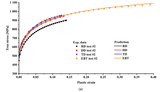 The true stress–strain curves for the uniaxial tensile test were computed along the three loading directions of RD, DD, and TD after the load–stroke curves of each group with the best repeatability were chosen. The stress–strain curves for EBT are displayed in Figure 4. Figure 5 compares the stress–strain curves from the tensile and bulging tests with the hardening curves calibrated using the Swift–Voce function as follows:
