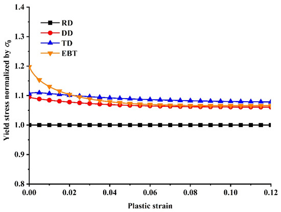 where is the effective plastic strain and ,, , and align with the hardening results under uniaxial tension conditions along RD, DD, and TD and equibiaxial stress.