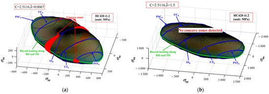 As long as the effective plastic strain is within the range [0, 1.8] in Figure 7, the hardening law for HC420, a BCC material, stays inside the convex domain. The yield surfaces for the two sites = 0.0067, c = 2.5116, and = 1.5, c = 2.5116 are shown in Figure 8. Red dots indicate areas of the yield surfaces that are depressed. As seen in Figure 8a, the yield surface is concave because the point = 0.0067 and c = 2.5116 is beyond the convex domain. Here, the plane strain state is surrounded by four concave regions. On the other hand, the convex with no concave areas is at point = 1.5 and c = 2.5116.