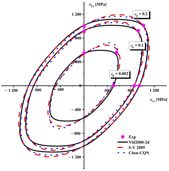To validate whether the yield function accurately describes the anisotropic features of HC420, the expected yield trajectories obtained from the Yld2000-2d, S-Y 2009, and Chen-CQN yield functions were compared with experimental observations. The calibrated coefficient values of the Yld2000-2d model at different levels of plastic strain in HC420 were derived from the hardening curve data of the material and are summarized in Table 3.