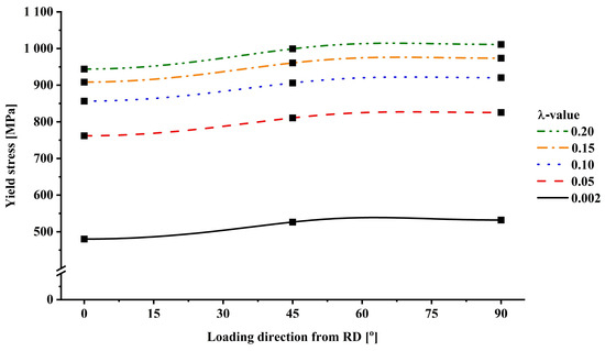 where and are the experimental and predicted stress, respectively, and and are the experimental and predicted r-values, respectively. Parameters and are the weighting factors for stress and the r-value. Both i and j represent data points used to optimize material parameters, typically 0°, 45°, and 90°