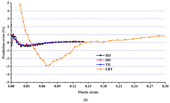 Figure 12 compares the hardening curves of HC420 under uniaxial stress at three loading orientations, i.e., RD, DD, and TD, with experimental data and under EBT for predictions by the Chen-CQN yield function. It is seen that the predicted uniaxial tensile anisotropic hardening curves agreed closely with the actual data, with only a small deviation between the predicted and experimental curves under EBT. The prediction error between the Chen-CQN and experimental stress was calculated using Equation (16), and the prediction error is shown in Figure 12b; the largest inaccuracy in the Chen-CQN function’s predictions of hardening curves during plastic deformation under uniaxial strain was consistently less than 1%. Furthermore, the prediction error gradually diminished as the strain rose, finally nearing zero. Under EBT circumstances, the highest inaccuracy occurred at the start of plastic deformation, when irregularities in the material’s hardening curve were more noticeable, resulting in significantly lower forecast accuracy. However, throughout the plastic deformation process, up to necking, the difference between the prediction and experimental curves under equibiaxial stress was less than 2%. These findings demonstrate that the anisotropic hardening behavior of HC420 is accurately characterized by the Chen-CQN yield function and meets the required accuracy standards for numerical simulations.
