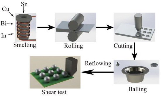 Schematic diagram of solder alloy preparation, reflow soldering, and shear test.