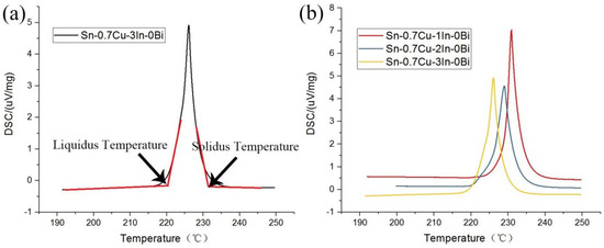 There have been numerous studies on reducing the melting point and enhancing the mechanical properties of solder by adding alloy elements to the brazing material. Shuang et al. [14] found that the addition of the In element to the Sn-0.7Cu solder significantly lowered the melting point of Sn-0.7Cu. After adding 5 wt.% of the In element, the melting point of Sn-0.7Cu decreases from 223.7 °C to 202.6 °C, and the tensile strength of Sn-0.7Cu increases, while the elongation rate significantly decreases. It can be inferred that the addition of the In element can effectively lower the melting point of Sn-0.7Cu and enhance its mechanical properties. Ren et al. [15] studied the influence of the In element on the microstructure and properties of SAC305. The addition of the In element could transform the original Ag3Sn and Cu6Sn5 compounds in the solder into Ag3(Sn, In) and Cu6(Sn, In). Additionally, the addition of the In element also enhanced the hardness of the solder. Ramli et al. [16] found that the addition of the Bi element reduced the wetting angle of the solder and improved its wettability. Furthermore, it was found that the addition of the Bi element affected the growth of the IMC layer due to its inhibitory effect on Cu diffusion. The intermetallic compound (IMC) layer size of the Sn-Cu-Bi solder was smaller than that of the Sn-Cu solder. The addition of the Bi element provided more nucleation sites, leading to a reduction in the size of the β-Sn phase and grain, thereby enhancing the hardness.