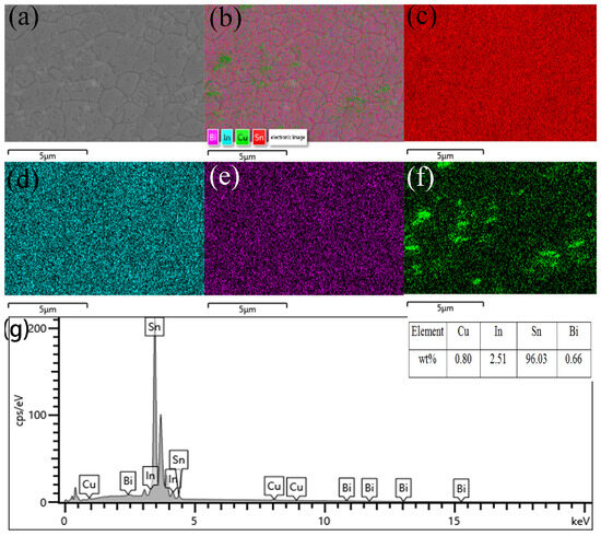 (a) SEM image of the Sn-0.7Cu-1Bi-3In solder and the corresponding element map distribution of (b) all elements, (c) Sn, (d) In Bi, (e) Sn, (f) Cu, and (g) EDS result.