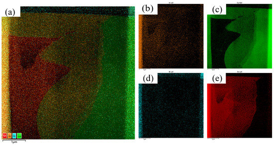 The scanning image and EDS image of Sn-0.7Cu-3In-1Bi are shown in Figure 3. The microstructure images of solder with other contents are similar to this, so only one type of microstructure image is listed here. From Figure 3, it can be known that the elements Bi and In are evenly distributed in the solder, and there are no obvious compounds or separate phases present. From Figure 3f, the green part represents the distribution of the element Cu. According to the Sn-In phase diagram and the Sn-Bi phase diagram, and compared with the solubility of Bi and In in Sn at room temperature, the content of the elements added in this paper is lower, so Bi and In can be well dissolved in Sn, so they are evenly distributed. From the point of view of the melting point, the melting points of Bi, In, and Cu are 271.3 °C, 156.51 °C, and 1083.4 °C, respectively. Cu has the highest melting point, so it is easier to form segregation. In addition, at room temperature, a small amount of Bi can be dissolved in Sn to form a solid solution, and In and Sn can form a replacement solid solution, but Cu exists in the form of IMC. So Bi and In did not show signs of segregation, whereas Cu seems to be highly affected.