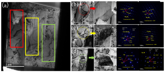 In order to further analyze the crystallographic information of each phase in Figure 4, a detailed crystallographic information analysis was performed using high-resolution transmission (HRTEM) and selected area electron diffraction spot (SAED) to form Figure 5. Figure 5a shows the overall morphology of the sample after FIB cutting. Figure 5b–d correspond to the three regions of Figure 5a, respectively. After the SAED, the image on the right side of the image was generated. It can be seen from Figure 5b that the crystal plane spacing d is 2.5182 Å, 2.0623 Å, and 4.1206 Å, and 4.5946 Å, 2.9137 Å, and 2.5182 Å, respectively, and the corresponding crystal planes are (0), (200), (301), (211), (110), and (0), and the crystal band axes are [] and [0]. After a comparison with the standard PDF card, it is found that this phase is Sn19In. It can be seen from Figure 5c that the crystal plane spacing d is 2.8354 Å, 1.5921 Å, 2.5144 Å, and 3.6548 Å, 2.9265 Å, and 4.8854 Å, respectively, and the corresponding crystal planes are (), (530), (22), (020), (022), and (), and the crystal band axes are [] and []. After a comparison with the standard PDF card, it is found that this phase is Cu6Sn5. It can be seen from Figure 5d that the crystal plane spacing d is 2.0171 Å, 1.4419 Å, and 1.4843 Å, and 1.7679 Å, 1.2683 Å, and 1.7933 Å, respectively, and the corresponding crystal planes are (), (321), (112) and (112), (411), (), and the crystal band axes are [] and []. After a comparison with the standard PDF card, it is found that this phase is Sn. According to the PDF card, the theoretical values of crystal plane spacing d of Cu6Sn5 are 2.8901 Å, 1.6212 Å, and 2.5144 Å. There is a small error between the theoretical value and the measured value. In Figure 4b, the selected particles contain a small amount of the In element, indicating that they are not Cu-Sn intermetallic compounds. Because Sn and In atoms are similar in size, the intermetallic compounds are doped with a small amount of In atoms, and the Cu, Sn, and In elements are uniformly distributed in the compounds. The same situation also appears in Figure 5d. According to the PDF card, the theoretical values of the crystal plane spacing d of Sn are 1.5588 Å, 1.3347 Å, and 1.7172 Å; for Bi, they are 1.7957 Å, 1.0498 Å, and 1.861 Å. But in Figure 4d, element Bi has no aggregation area, indicating that Bi exists in the form of a solid solution in Sn.
