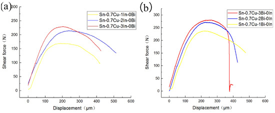 Shear strength is the most important indicator for evaluating the mechanical properties of solders. In this paper, BGA solder joints with different contents of Bi and In elements were fabricated, and their shear strength was tested according to the JESD22-B117B standard [17]. Figure 6a shows the force-displacement curves for different In element contents when the Bi element is set to 0. The curves indicate that the strength of the solder joint gradually increases with the increase of the In element. The displacement curve shows that the displacement does not change significantly with the increase in the In element. Therefore, it can be concluded that the increase in the In element can enhance the strength of the solder joint without reducing its plasticity. Figure 6b shows the force-displacement curves for different Bi element contents when the In element is set to 0. The curves indicate that the strength of the solder joint slightly increases with the increase of the Bi element, while the displacement slightly decreases. In addition, comparing Figure 5a,b, the effects of the In element on enhancing strength is greater than that of the Bi element. In summary, both Bi and In have the effect of enhancing the Sn-0.7Cu, with In having a better enhancing effect than Bi. Meanwhile, In can enhance the shear strength of the solder without significantly reducing its plasticity, while Bi can enhance the strength of the solder but has a certain impact on its plasticity.