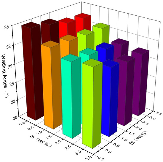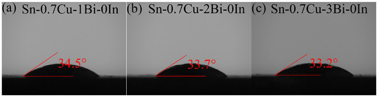 Wettability is an important indicator for measuring the solderability of solders. As shown in Figure 8, the wettability angles are presented for different Bi contents when the In content is 0 wt.%. By comparing Figure 8a–c, it can be seen that as the Bi content increases, the wettability angle of the solder joint gradually decreases. Therefore, with the increase of the Bi element, the solderability of the solder joint gradually improves.