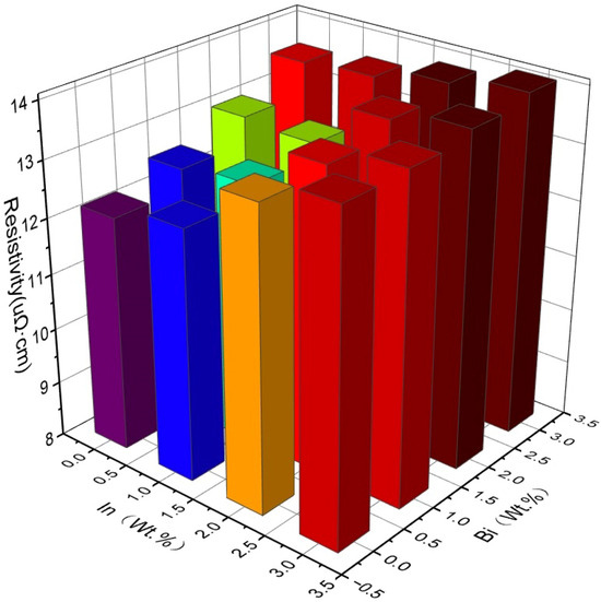Electrical connectivity is an important property of solders. Therefore, this article measured the resistivity of solders with different contents of Bi and In. The measurement results are shown in Figure 10. As can be seen from Figure 10, the overall resistivity of the solder increases with the increase of Bi and In content. When the content of Bi and In in the solder reaches 3 wt.%, the resistivity reaches 14.1 μΩ·cm, while the resistivity of Sn-0.7Cu is 12.35 μΩ·cm. The conductivity of Sn-0.7Cu-3Bi-3In is about 14% lower than that of Sn-0.7Cu. The conductivity of Sn-0.7Cu-3Bi-3In is about 8% lower than that of SAC305 with a resistivity of 13 μΩ·cm. The resistivity of alloys is generally higher than that of pure metals. The more elements in an alloy, the higher the resistivity. The atomic sizes of different elements are different, which can lead to lattice distortion. Under the action of the electric field, electrons collide and scatter when they move inside the lattice, which hinders the movement of electrons, thus increasing the resistance.