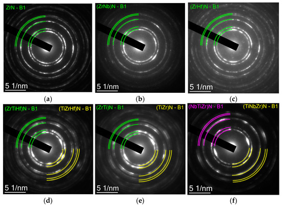 Phase SAED analysis of the studied coatings. (a) ZrN; (b) (Zr,Nb)N; (c) (Zr,Hf)N; (d) (Ti,Zr,Hf)N; (e) (Zr,Ti)N; (f) (Ti,Zr,Nb)N.
