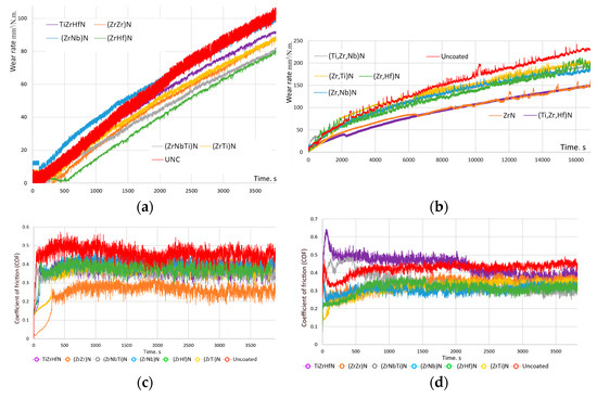 Studies of the tribological properties of samples have shown that all coatings under consideration can significantly reduce the friction coefficient (Figure 3c,d). The lowest friction coefficient (about 0.25) is demonstrated by the ZrN-coated sample. The highest value of the friction coefficient for coated samples was shown by a sample with a (Zr,Nb)N coating. Samples with other studied coatings showed similar values of the friction coefficient (0.32–0.42). In this case, the friction coefficient for the uncoated sample is about 0.45.