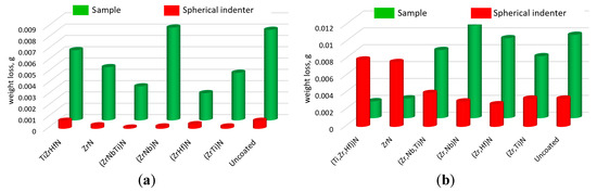 A comparison of the data on the final mass losses of the samples and the indenter (Figure 4) shows that the Al2O3 indenter wears out incomparably less than the samples with all types of coatings and without coatings. In order to compare these values on one diagram, the indenter mass loss was increased by 10 times (this value is close to the measurement accuracy limit of the scale, so a correct comparison of the values is impossible here). Since the parameters of the titanium alloy Ti-6Al-4V and 52100 bearing steel are comparable (see above), their wear rates are also comparable. It is worth considering the difference in geometry between the indenter (ball) and the sample (flat surface). In two cases (for samples with ZrN and (Ti,Zr,Hf)N coatings), the indenter wears out more intensively than the sample. Thus, by applying a coating, it is possible not only to increase the wear resistance of parts but also to ensure (with the appropriate choice of coating composition) a uniform wear of elements in a tribological pair.