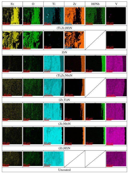 When analyzing the distribution maps of chemical elements on the surface of the samples (Figure 6), it is obvious that in the area of wear tracks of samples with ZrN and (Ti,Zr,Hf)N coatings, an increased content of iron and oxygen is observed, and the configurations of the areas of content of these elements coincide, which may indicate the formation of iron oxide. The high iron content correlates well with the high wear intensity of the steel indenter during friction in contact with these samples. At the same time, in these samples, titanium is present in a high concentration in the form of separate islands and coincides with similar areas of a high vanadium concentration (the area with insignificant titanium intensity in the (Ti,Zr,Hf)N coating is associated with the presence of this element in the coating itself, close titanium intensity is observed on the surface of all titanium-containing coatings). Thus, it is obvious that the coating on these samples has been largely preserved. The remaining samples show complete destruction of the coating in the wear track area. There is an area of high Ti/V intensity corresponding to the surface of the uncoated sample.