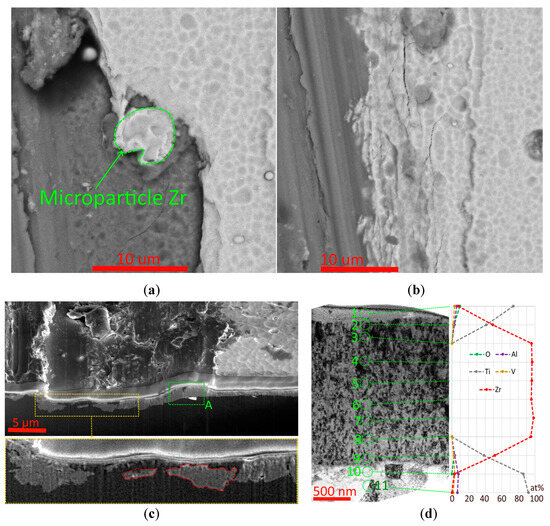 In the pin-on-disk test in contact with the Al2O3 indenter, brittle failure of the ZrN coating is observed (Figure 7a,b). Zirconium microparticles continue to maintain contact with the substrate even when the surrounding ZrN coating is destroyed (Figure 7a). Thus, it can be concluded that the adhesive bond between zirconium and titanium alloy is strong enough. Examination of the cross-section of the destruction zone shows that the coating as a whole continues to maintain good contact with the substrate (Figure 7c). Individual fragments of the coating are pressed into the substrate during interaction with the Al2O3 indenter. Analysis of the distribution of elements across the coating thickness after the pin-on-disk test (Figure 7d) shows the presence of a titanium alloy adherent on the coating surface; oxygen is present in this adherent (possibly due to titanium oxidation). Titanium diffusion takes place both on the coating surface (from the adherent to a depth of up to 100 nm) and at the substrate–coating boundary (to a depth of up to 250 nm). In the substrate–coating boundary area, oxygen is also present in small quantities, which may indicate the preservation of oxide film fragments in this area.