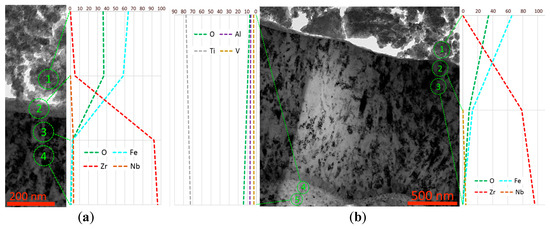 There is active oxidation of the steel in the contact zone with the coating. The interdiffusion of zirconium and titanium from the coating into the indenter material (to a depth of up to 50 nm) and iron from the indenter into the coating (to a depth of up to 200 nm) is observed (Figure 10c–e). The presence of a high concentration of oxygen in the adherent area indicates the active oxidation of the indenter material (primarily iron).