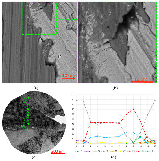 The formation of transverse cracks passing through the structure of the (Zr,Hf)N coating is also observed upon contact with the AISI 52100 bearing steel indenter (Figure 12). This fact indicates the high brittleness of this coating. The substrate material adherent present on the coating surface is partially introduced into the crack. The diffusion of titanium from the adherent into the coating is observed. The presence of oxygen indicates the oxidation of the adherent material (primarily titanium). The crack completely cuts through the coating layer and passes into the substrate (Figure 12).