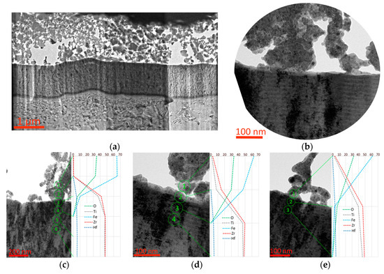 Cross-section of the wear area of a specimen with a (Zr,Ti,Hf)N coating in contact with an AISI 52100 bearing steel indenter. (a) general view of the coating with an adhesion of the indenter material, (b) nature of the adhesion of the indenter elements, (c–e) study of the elemental composition at the boundary of the coating and the adhesion of the indenter material.